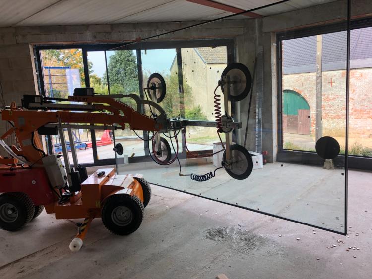 Pour les chantiers complexes où l'accès est difficile, nous sommes équipés de ventouses et d'un robot afin de poser des vitrages lourds en toute sécurité.